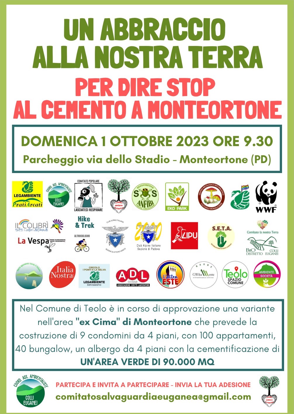 Domenica 1° ottobre cittadini e associazioni manifesteranno a Monteortone, ed Europa Verde sarà presente al loro fianco, per dire NO all’approvazione della variante nell’area ‘ex-cima di Monteortone’, che vede la costruzione di 9 condomini da 4 piani, un albergo e ulteriore cementificazione in un’area di 90.000 mq.
