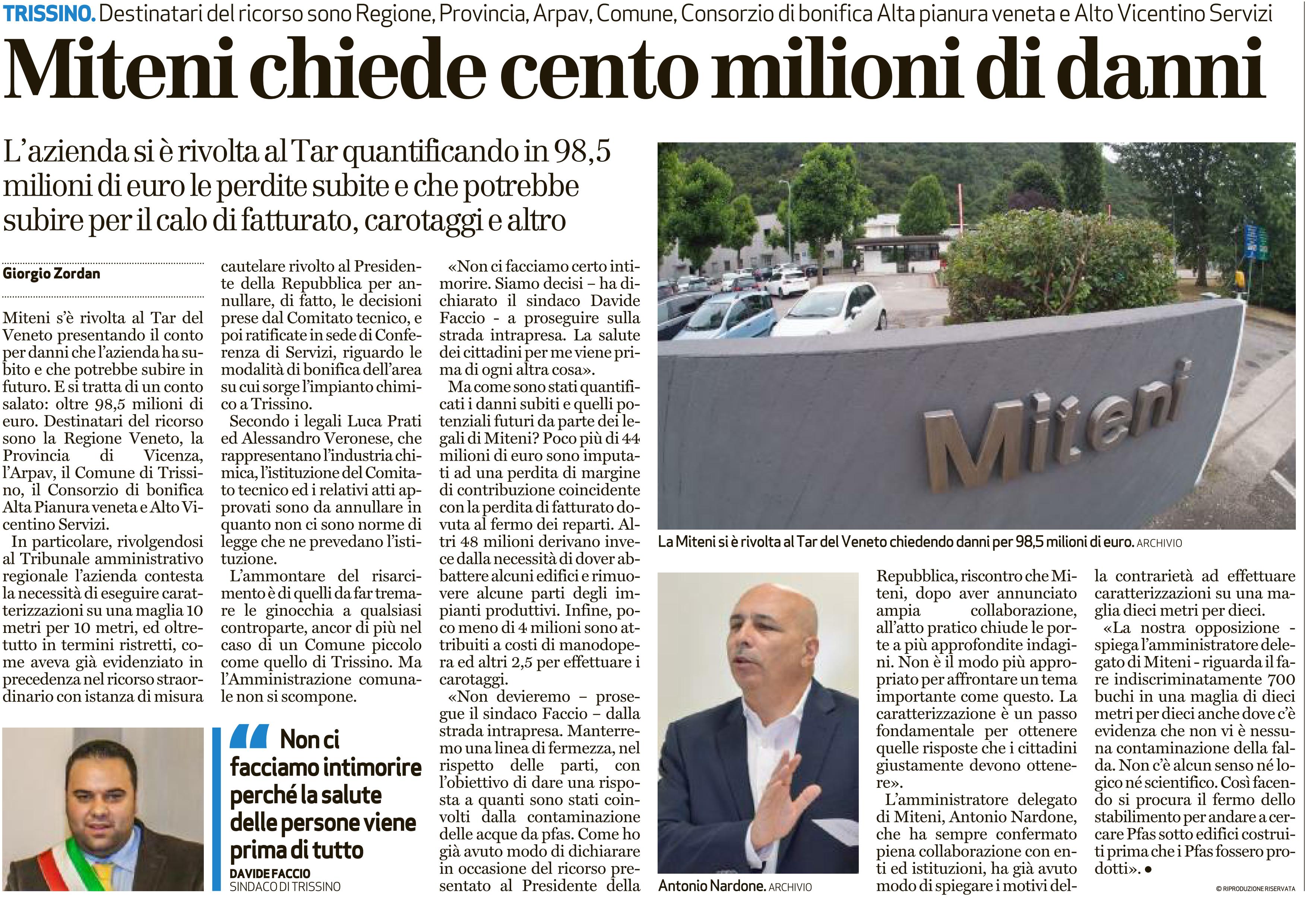 Questa è la mia considerazione, assieme il mio collega Andrea Zanoni, alla luce del ricorso presentato al Tar del Veneto dalla Miteni, uscito sulla stampa oggi, e con il quale avrebbe quantificato in 98,5 milioni di euro i danni causati dagli interventi di Regione, Comune e Arpav.