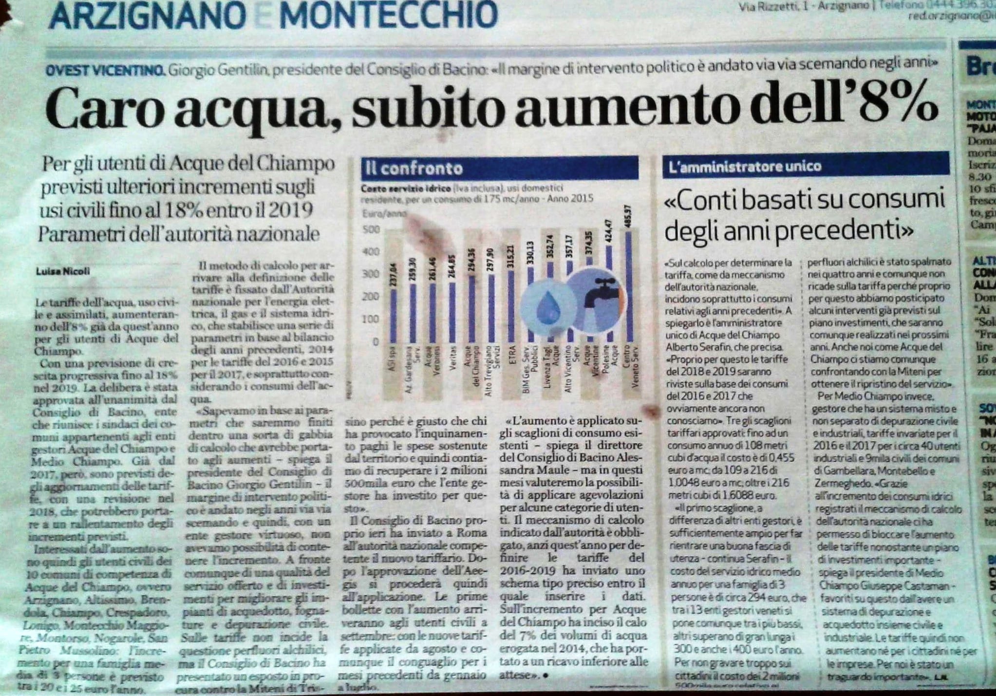 Non è la prima volta che ci troviamo di fronte a questi rincari (sotto potete leggere l’articolo di giornale del 25 giugno 2016), confermati da Acque del Chiampo Spa anche in commissione ecomafie ed incomprensibili, visto che gli altri gestori colpiti dall’inquinamento Pfas non hanno operato questa scelta.