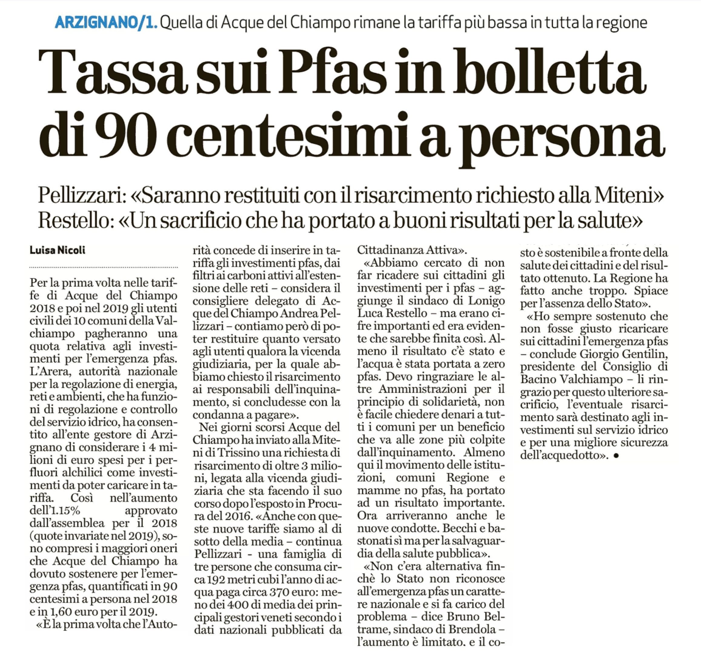 Articolo del 05 giugno 2018 – Tassa Pfas in bolletta