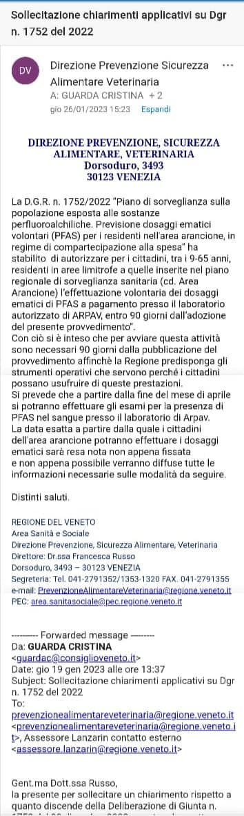 Sto lavorando anche su questo aspetto, con le Mamme NoPfas – genitori attivi – area contaminata, Gruppo Gas e altri comitati: la Regione stessa dichiara necessario rivedere il RISCHIO SANITARIO e questo ci conferma come l’area arancio dovrebbe essere trattata come avvenuto in principio per l’area rossa.